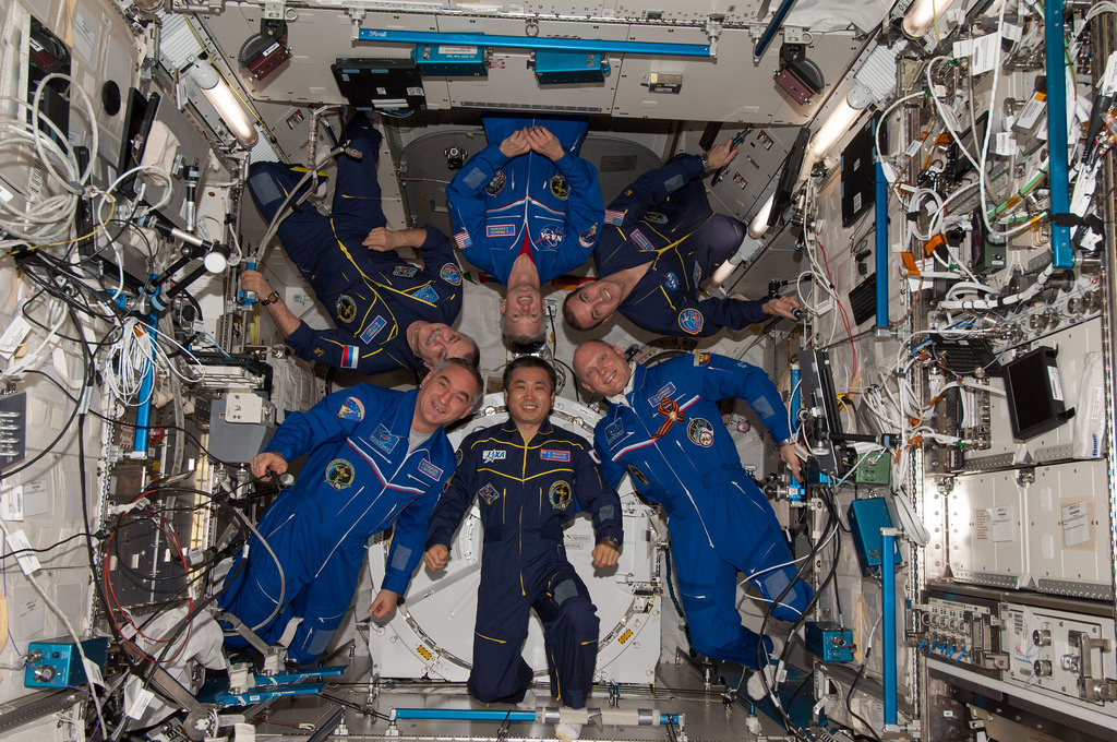 Les six membres de l'équipage Expedition 39 rassemblés dans le laboratoire Kibo à bord de l'ISS pour une photo de famille en vol. Le commandant Koichi Wakata est en bas au centre. Dans le sens des aiguilles d'une montre à partir de Wakata : Alexander Skvortsov, Mikhaïl Tyurin, Steve Swanson, Rick Mastracchio, Oleg Artemiev