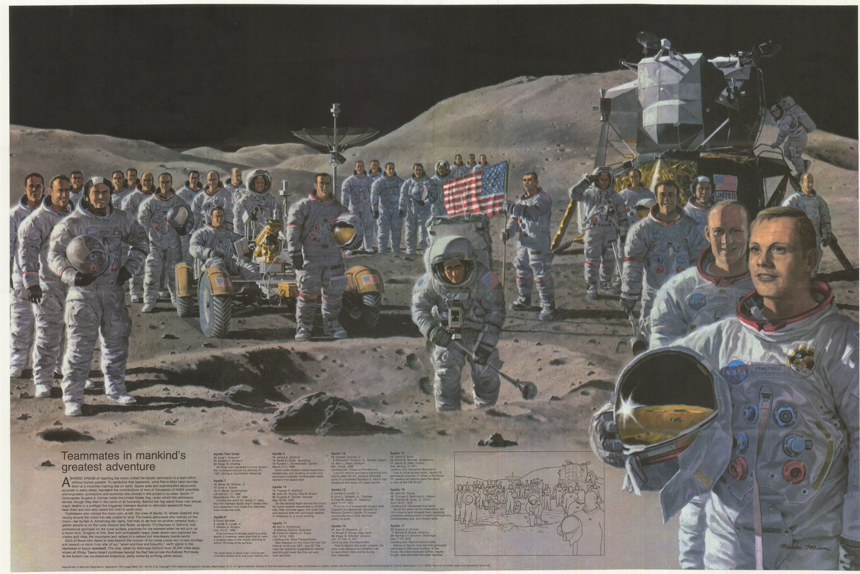 Pour mémoire également, les 24 astronautes qui ont tourné autour de la Lune sont Frank Borman (Apollo 8), James Lovell (Apollo 8 et 13), William Anders (Apollo 8), Thomas Stafford (Apollo 10), John Young (Apollo 10 et 16), Eugene Cernan (Apollo 10 et 17), Neil Armstrong, Michael Collins et Edwin « Buzz » Aldrin (Apollo 11), Charles « Pete » Conrad, Richard Gordon et Alan Bean (Apollo 12), John Swigert et Fred Haise (Apollo 13), Alan Shepard, Stuart Roosa et Edgar Mitchell (Apollo 14), David Scott, Alfred Worden et James Irwin (Apollo 15), Thomas « Ken » Mattingly et Charles Duke (Apollo 16), Ronald Evans et Harrison « Jack » Schmitt (Apollo 17).