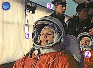 Dans le bus qui emmènera Gagarine (1) sur le pas de tir dans 2 jours, Titov (2) sera également en tenue de vol, au cas où et Nelioubov (3) en tenue militaire. Exclu du groupe des cosmonautes pour indiscipline 2 ans plus tard, Neliobov n’acceptera pas son sort et mettra fin à ses jours en 1966.