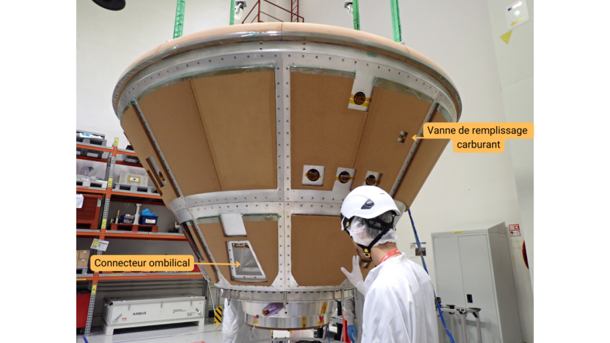 Au moment du reportage, la capsule n’avait pas toute sa protection thermique en place afin d’accéder à l’intérieur. Le collage de la protection (un secret industriel) sera presque finalisé totalement à Munich avant de partir en campagne de lancement. Il restera quelques emplacements à finaliser dans les derniers jours avant le décollage comme les interfaces de manutention ou la « service door » pour le remplissage en carburant.
