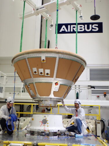 Lors des tests de vibrations qui simulent le décollage, la capsule a été placée comme en configuration lancement : la face qui fera la rentrée atmosphérique vers le haut, l’interface avec le lanceur se trouvant vers la partie la plus étroite.