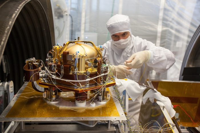 Préparation de l’instrument SEIS pour des essais vide thermique chez Intespace à Toulouse (credit CNES/MALIGNE Frédéric, 2015)