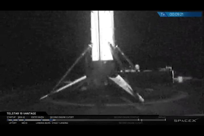 Capture d’écran de l’atterrissage réussi de premier étage du lanceur Falcon 9 / Telstar 19V le 22/07/2018 (credit SpaceX live)