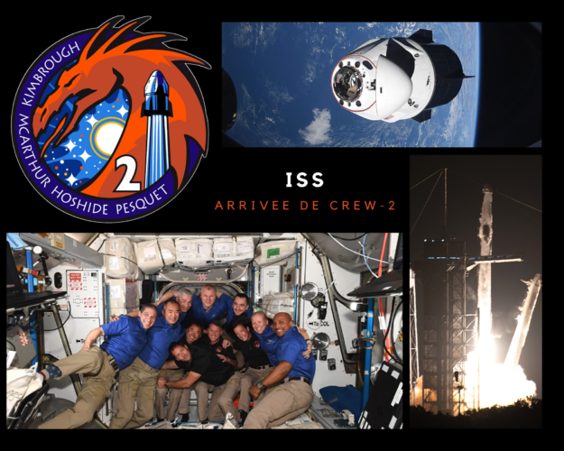 Le 23 avril, l’équipage Crew-2 dont le Français Thomas Pesquet a décollé à bord d’une Falcon 9. Leur vaisseau Crew Dragon Endeavour a rejoint l’ISS le 24 avril.