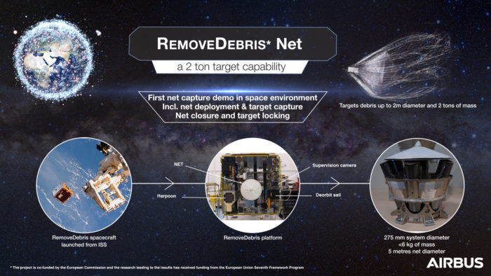 Le 16 septembre, l’un des 2 cubesats 2U, DebrisSAT-1, embarqué à bord de RemoveDEBRIS a été libéré. Un filet a ensuite été éjecté et a capturé avec succès le cubesat à une distance éloignée (entre 5 et 7 mètres) du satellite porteur. Le cubesat ainsi attrapé va désormais effectuer une désorbitation rapide.