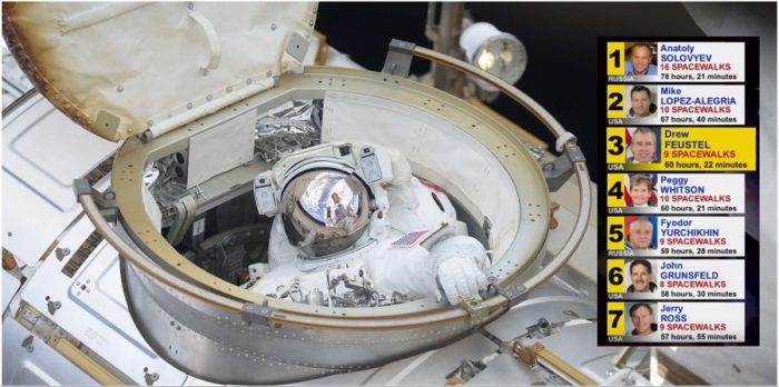 En effet, Drew Feustel pointe désormais en 3e position (médaille de bronze) dans ce classement alors qu’il était 7e avant cette EVA.