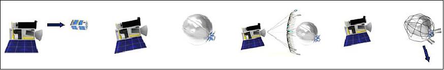 A la fin de vie de RemoveSAT, une voile solaire (dragsail) sera déployée afin de désorbiter plus rapidement le satellite. La voile se compose de 2 parties: un déployeur gonflable qui éloigne la voile de la plate-forme (empêchant la voile de heurter tout matériel en surplomb de la plateforme, par exemple des antennes) et un mécanisme d’extension qui utilise un moteur pour déployer les membrures de voile. Le déployeur est un mécanisme gonflable qui se déploie sur une longueur de 1 m et s’auto-durcit. Le mécanisme d’extension se compose de quatre flèches roulées dans un distributeur central qui permet un déploiement contrôlé de la voile.