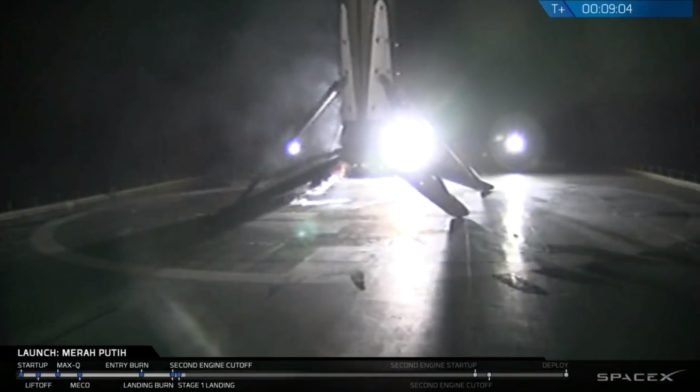 Le premier étage utilisé avait volé en mai avec le satellite Bangabandhu-1 pour le Bangladesh. Il a réussi a atterrir pour la seconde fois sur la barge « Of Course I Still Love You » dans l’Océan Atlantique, soit seulement 3 mois après sa première utilisation. En comparaison, SpaceX avait mis 11 mois entre le vol d’un booster (avril 2016) et sa réutilisation (mars 2017).