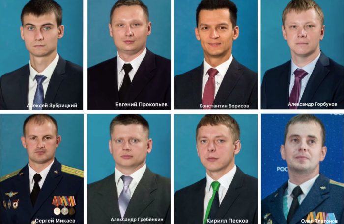 Sélection 2018 des cosmonautes de Roscosmos (de haut en bas, de gauche à droite) : Aleksey Zubritskiy, Yevgeniy Prokopyev, Konstantin Borisov, Aleksandr Gorbunov, Sergey Mikayev, Aleksandr Grebyonkin,, Kirill Peskov, et Oleg Platonov (credit Roscosmos via Shutlle Almanac)