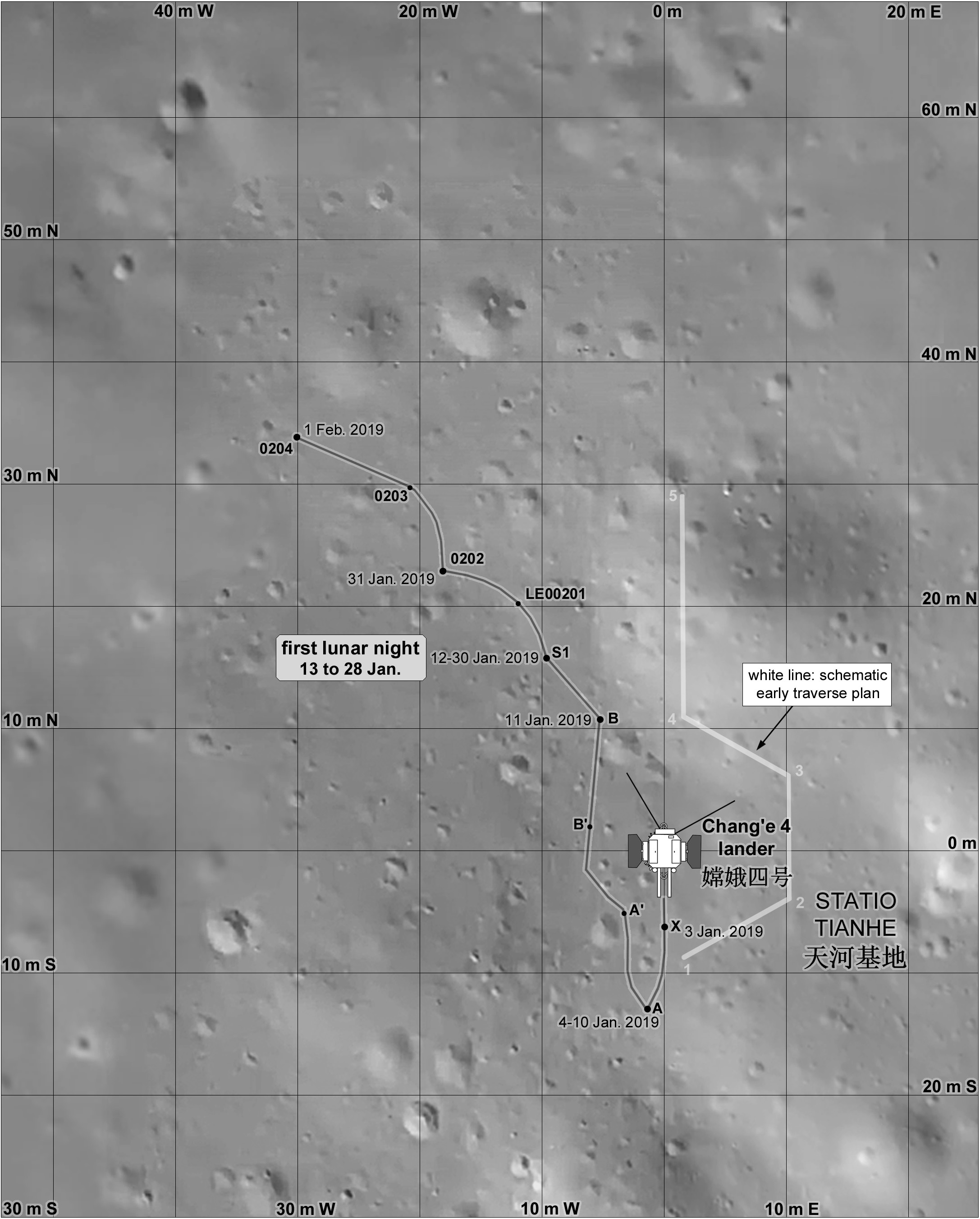 Enfin, l’IAU (International Astronomical Union) a approuvé l’attribution par la CNSA des noms du site d’alunissage, ainsi que de trois petits cratères et du pic central du cratère Von Kàrmàn. Tout d’abord, le site d’alunissage s’appelle désormais Statio Tianhe. Tianhe signifie le fleuve céleste qui relie Niulang à Zhinyu selon l’histoire du Bouvier et de la Tisserande, une des plus grandes légendes du folklore chinois. Les astronomes chinois l’associaient à la bande de la Voie Lactée dans le ciel. Les autres noms attribués proviennent de la même histoire.