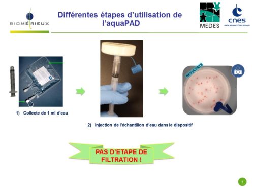 La mise en œuvre de l’expérience Aquapad est facile pour l’astronaute : il doit récupérer une petite quantité d’eau, prendre une seringue pour prélever l’eau du sac et ensuite l’injecter dans le « pad ». Ensuite, il attend l’incubation pour l’interprétation des résultats.