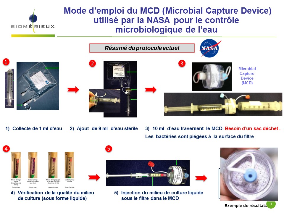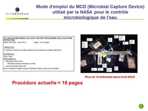 Actuellement les analyses effectuées à bord de l’ISS par le système mis au point par la NASA utilisent 10 ml d’eau (1 ml qui est analysé et 9 ml d’eau stérile), et nécessitent beaucoup de manipulations par l’astronaute. Cela monopolise également beaucoup de matériel et donc génère des déchets.