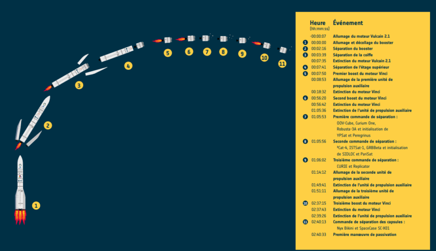 Le premier réallumage sera suivi du déploiement des 3 premiers satellites [Les charges utiles du vol inaugural d’Ariane 6] : OOV-Cube, Curium One et Robusta-3 A, et de l’activation de deux de ses expériences embarquées, YPSat et Peregrinus.