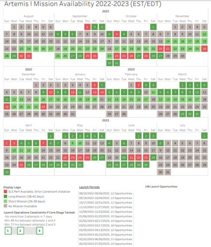 La mécanique orbitale de la Terre et de la Lune (la Terre tourne sur son axe et la Lune orbite autour de la Terre chaque mois selon son cycle lunaire) donne un planning d’environ deux semaines d’opportunités de lancement, suivies de deux semaines sans opportunités de lancement.