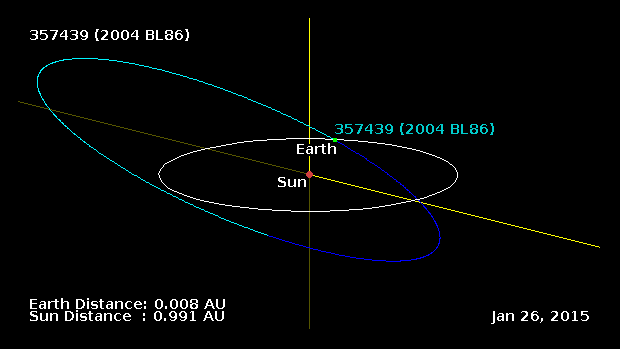 L'orbite de l'astéroïde 357 439 (2004 BL86) est inclinée de 23,7 ° à celle de la Terre et il s'est approché de notre planète en dessous du plan de l'écliptique, nous manquant par seulement 3,1 distances lunaires (1200000 km) à 16h20 GMT le 26 Janvier 2015.  Crédit image: NASA JPL de Petit-Corps Database Browser / Osamu Ajiki / Ron Baalke / Ade Ashford