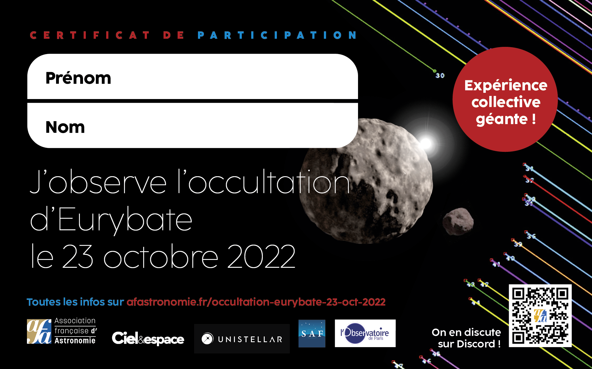 Si vous voulez participer à la science et si vous avez un minimum d’équipement, vous obtiendrez les détails pratiques et l’inscription sur le site de L’Association Française d’Astronomie : https://www.afastronomie.fr/occultation-eurybate-23-oct-2022