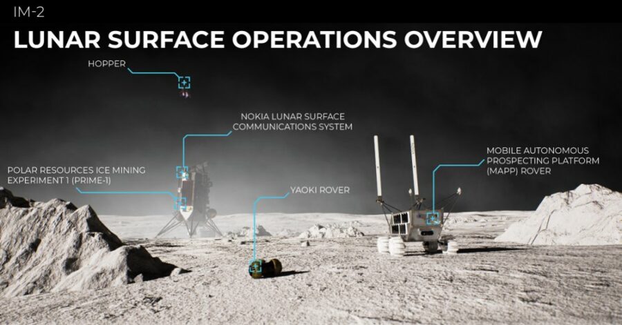 La mission IM-2 transporte cette fois plus de charges utiles de la NASA : 10 au lieu des 6 sur IM-1. D’autres clients commerciaux sont à bord du lander : Lonestar Data Holdings, Columbia Sportswear, Nokia, Lunar Outpost, Puli Space, Dymon Co. Ltd, le Centre aérospatial allemand (DLR).