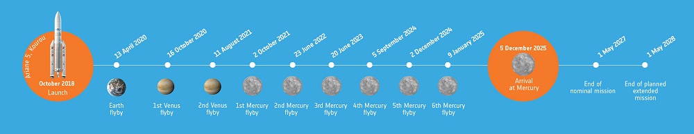 Au terme de 18 révolutions autour du Soleil, le module MTM sera éjecté à l’approche de Mercure fin 2025. Les deux orbiteurs scientifiques commenceront leur mission nominale d’un an, qui pourra être prolongée d’une année.