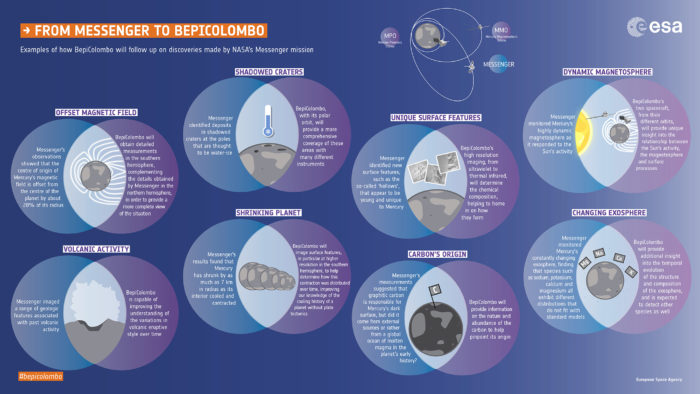 BepiColombo va compléter la mission Messenger, notamment sur la topographie et la composition de la surface de Mercure à l’hémisphère sud (Messenger avait une orbite elliptique qui passait près du pôle nord et loin du pôle sud). Avec une étude à 10 ans d’intervalles, cela permettra de voir aussi les changements de la planète, comme au niveau des dépôts (glace d’eau ?) observés par Messenger dans des cratères polaires perpétuellement dans l’ombre. BepiColombo, avec son orbite polaire, fournira une couverture plus complète de ces zones avec de nombreux instruments différents.