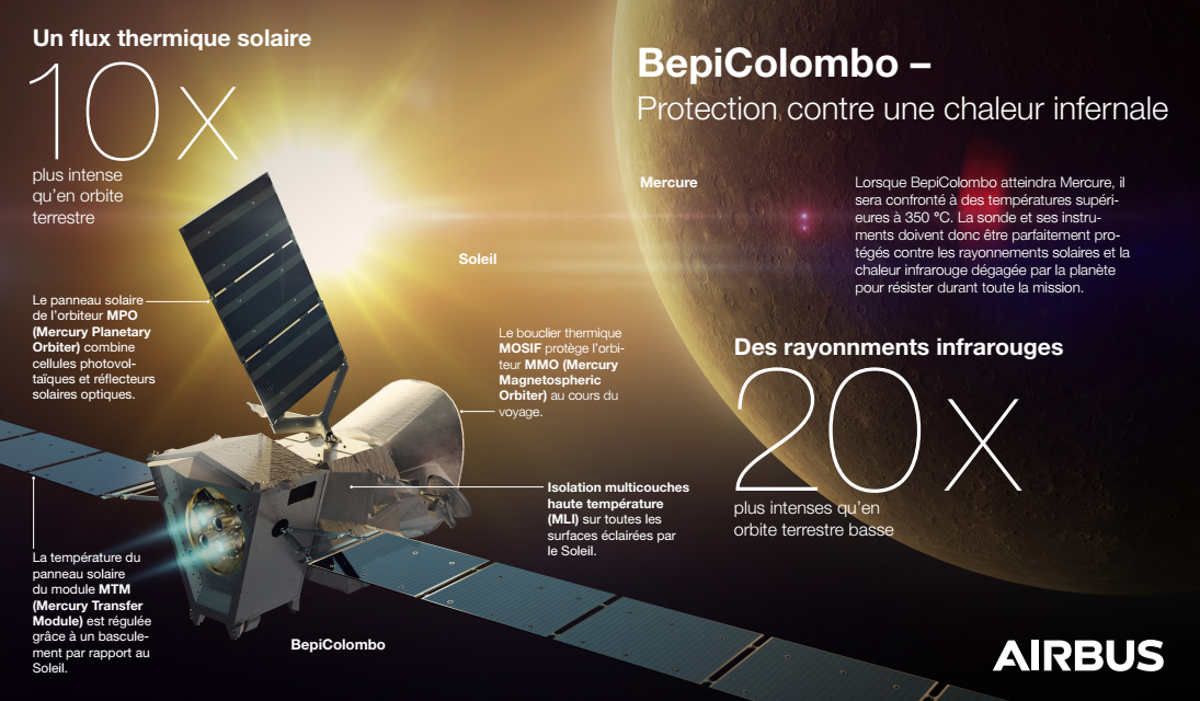 Les engins spatiaux en orbite de Mercure doivent non seulement faire face à l’immense chaleur du Soleil, mais également au rayonnement infrarouge émis par la planète. Le MPO est protégé par des couvertures thermiques souples (MLI, Multi Layer Insulation) en titane et en céramique (jusqu’à 50 couches au total). Les antennes sont en titane résistant à la chaleur et recouvertes d’un nouveau revêtement.