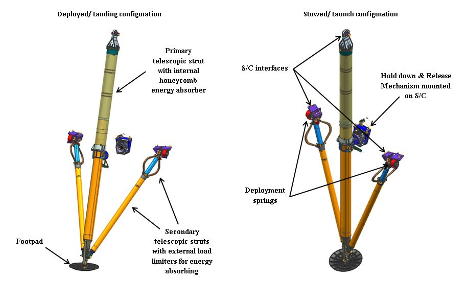 A gauche le système d’une « jambe » d’atterrissage du lander Beresheet en configuration déployée sur le sol lunaire, à gauche le système en configuration stockée pour le lancement (credit SpaceIL)