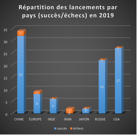 Les Etats-unis confortent leur 2e place mais la Russie réalise une belle année 2019 avec 22 lancements, tous réussis, une première depuis 16 ans.