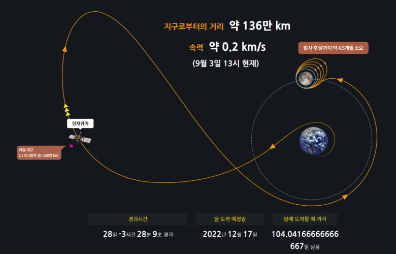 Au 3 septembre à 13h00 CEST, la sonde Danuri avait une vitesse de 0,2 km/s. Deux corrections de trajectoire ont été réalisées le 7 août et le 2 septembre. Six autres manoeuvres sont prévues d’ici la mise sur orbite lunaire. En raison du succès de la 2e manœuvre de correction de trajectoire, la prochaine manœuvre de correction de trajectoire initialement prévue le 16 septembre ne sera pas effectuée.