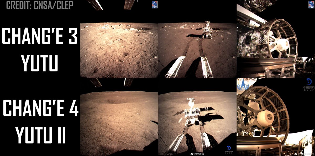 La CNSA n’a pas attendu longtemps pour libérer le rover Yutu-2. Avec les premières photos du sol prises par Chang’e-4 on pouvait déjà voir où allait évoluer le « lapin-de-jade-2 ». Immortalisé par une caméra de Chang’e-4, le premier mètre de Yutu-2 a été réalisé une demi-journée après l’alunissage. Tout comme Chang’e-4 est une copie améliorée de Chang’e-3, Yutu-2 est un double de Yutu, le premier rover lunaire chinois de 140 kg qui a fonctionné pendant plus d’un mois et a fait plus d’une centaine de mètres. Même son nom est resté inchangé alors qu’a l’occasion d’un concours, 42 945 noms différents avaient été proposés !