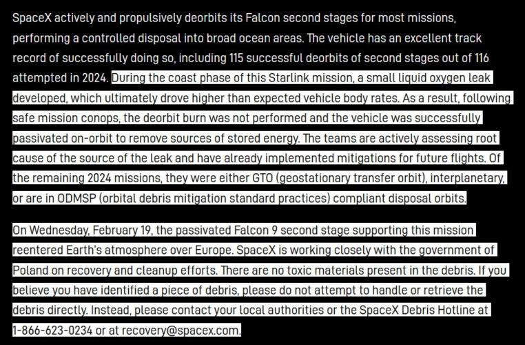 SpaceX a confirmé la provenance des débris et a déclaré travailler activement avec les autorités polonaises pour la récupération des débris et le nettoyage, en précisant qu’il n’y a pas de matière toxique dans les débris.