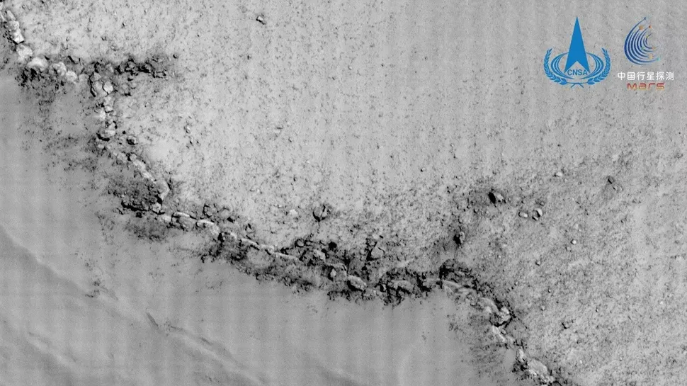 Un bord de cratère imagé par la caméra haute résolution de Tianwen-1 (crédit : CNSA / PEC)