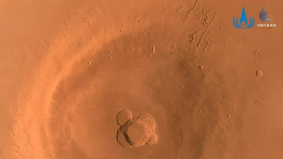 Ascraeus Mons et son cratère central imaginé par la caméra moyenne résolution de Tianwen-1 (crédit : CNSA / PEC)