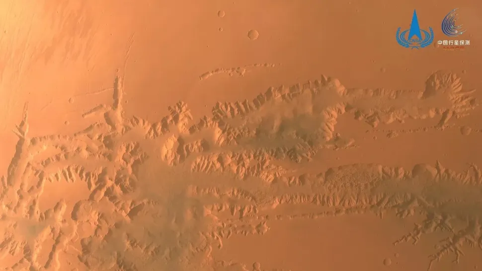Une section du système de canyons qui forme Valles Marineris capturés par la caméra moyenne résolution de Tianwen-1 (crédit : CNSA / PEC)
