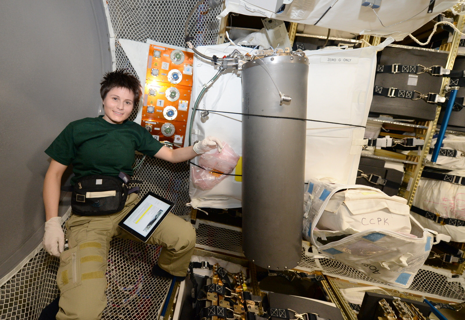 Un réservoir de saumure pour l'ensemble de traitement d'urine Samantha Cristoforetti : "Aujourd'hui, je me suis rendue dans l'ATV à nouveau. Cette fois j'ai pris avec moi un grand réservoir plein de saumure. Qu'est ce que la saumure ? Disons-le de cette façon: la saumure est ce qui reste quand nous avons fini de "transformer le café d'hier dans le café de demain", comme l'astronaute Donald Pettit l'a dit fameusement"   Crédits: ESA / NASA