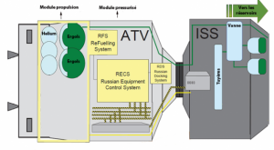 • L’ATV sert de « station essence » à l’ISS : l’ATV a amené du carburant pour la station. Une fois le carburant transféré de l’ATV à l’ISS, la Station peut alors l’utiliser pour son contrôle d’altitude (l’ISS a tendance à descendre naturellement, attirée par la Terre, et pour changer d’altitude en fonction des cargos qui y arrivent) ou  ses changements d’orientation. Désormais, seuls les cargos Progress pourront exécuter cette tache. (voir billet blog CNES « Plus que les Progress pour ravitailler l’ISS en carburant« )