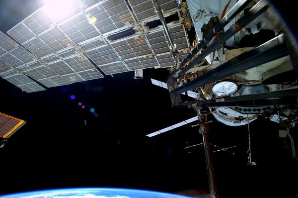 L'ombre de l'ATV-5 sur les panneaux de l'ISS. (Crédits : NASA/ESA)