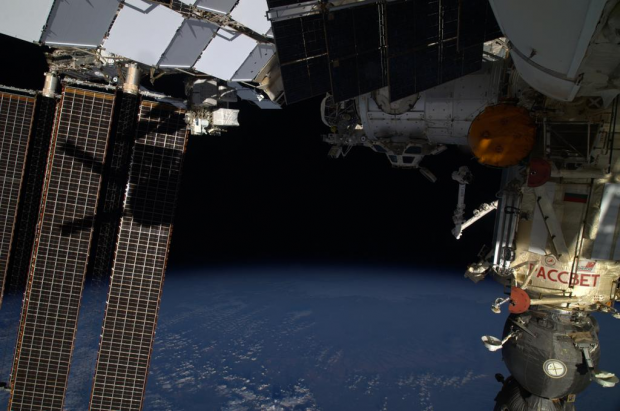 L’ATV5 attaché au module russe de l’ISS, la Terre et un panneau de la station. (Crédits : ESA)