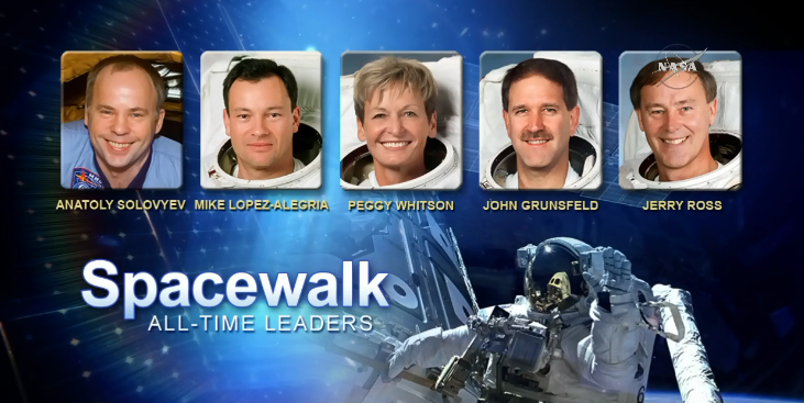 Les 2 premières places sont détenues par le russe Anatoliy Solovyov avec 16 EVA sur la station MIR et 78 heures cumulées, et Michael Lopez-Alegria avec 10 EVA et 67 heures.