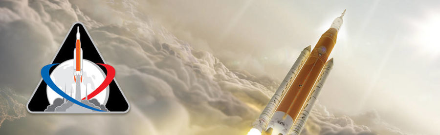 Illustration du lanceur SLS (Space Launch System) avec le logo de la mission Artemis-1 (crédit NASA)