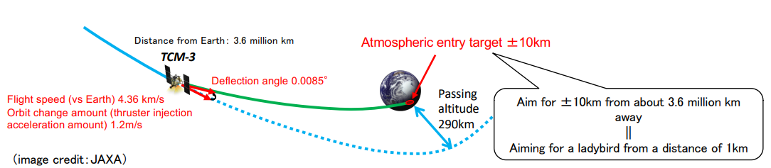 La TCM-1 (Trajectory Correction Maneuver), le premier contrôle orbital de la phase finale de guidage de rentrée, a eu lieu le 22 octobre dernier. Cette manoeuvre a changé l’altitude de survol de la Terre pour le mettre à environ 310 km. Puis TCM-2, effectuée le 12 novembre, a permis de rapprocher davantage l’orbite de survol à 290 km d’altitude de la surface terrestre.