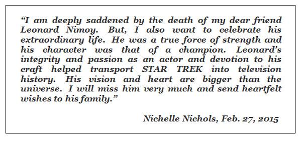 L’Administrateur de la NASA Charles Bolden a fait la déclaration suivante en apprenant le décès de Nimoy: « Leonard Nimoy était une inspiration pour plusieurs générations d’ingénieurs, de scientifiques, astronautes et autres explorateurs de l’espace. Comme M. Spock, il a fait de la science et de la technologie, une part importante de l’histoire, tout en ne manquant jamais de montrer, par exemple, que ce sont les gens autour de nous qui comptent le plus. La NASA a eu la chance de l’avoir comme ami et collègue. Il était beaucoup plus que le directeur scientifique de l’USS Enterprise. Leonard était un acteur de talent, réalisateur, philanthrope et un homme aimable dédié à l’art sous de nombreuses formes. Nos pensées et nos prières sont avec sa famille, ses amis, et les légions de fans de Star Trek à travers le monde ».