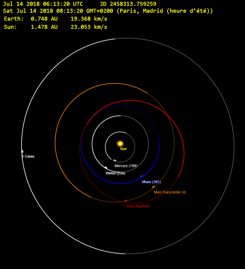 Le Roadster passera l’orbite de Mars en juillet 2018. Il atteindra son aphélie, le point de sa trajectoire le plus éloigné du Soleil, le 19 novembre.