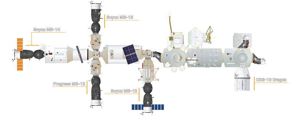 Configuration de l’ISS après la relocalisation du Soyouz MS-13 et l’amarrage du Soyouz MS-14 le 27/08/2019 (credit Orbital Velocity)