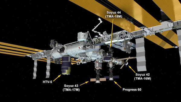 Désormais, ce sont 3 Soyouz qui sont amarrés à l’ISS : Soyuz TMA-16M au port Zvezda, le Soyuz TMA-17M au Rassvet, et Soyuz TMA-18M au Poisk. Il y a également un Progress et le cargo HTV 5.