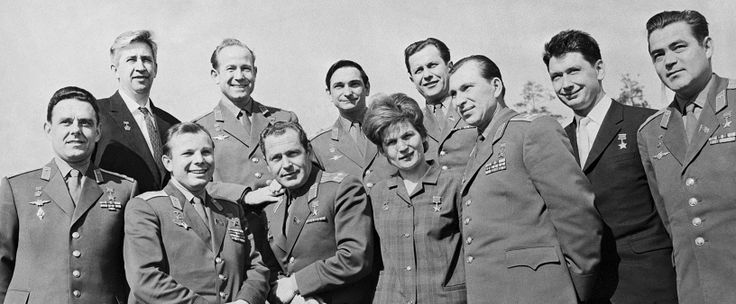 Cosmonautes soviétiques (de gauche à droite): Vladimir Komarov, Konstantin Feoktistov, Youri Gagarine, Alexei Leonov, Guerman Titov, Valery Bykovsky, Valentina Terechkova-Nikolayeva, Pavel Popovich, Pavel Belyaev, Boris Egorov, Andrian Nikolaïev (© Eugene Kassin et Valentin Cheredintsev / TASS Nouvelles en images)