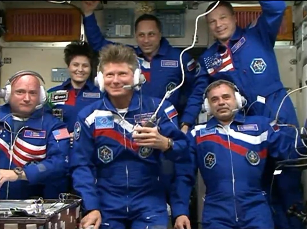A 3h33 UTC, la trappe a été ouverte et l’Expédition 43 a été réunie. S’en est suivie la traditionnelle conférence avec les familles à Baïkonour.