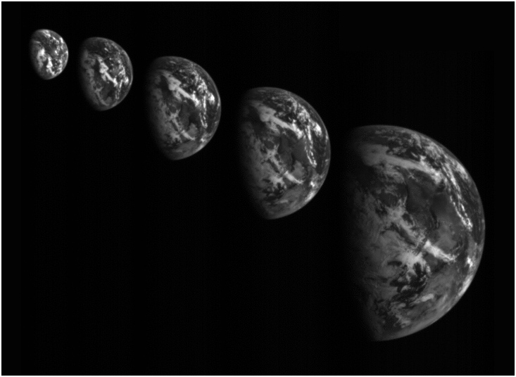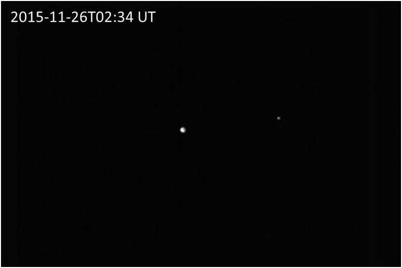 Le 26 Novembre 2015, la Terre et la Lune ont été photographiées par l’imageur thermique infrarouge TIR à bord de Hayabusa 2. L’image a été prise à une distance de 3 millions de kilomètres de la Terre, sous un l’angle Soleil-Terre-saellite à 52° au nord du plan de l’écliptique.