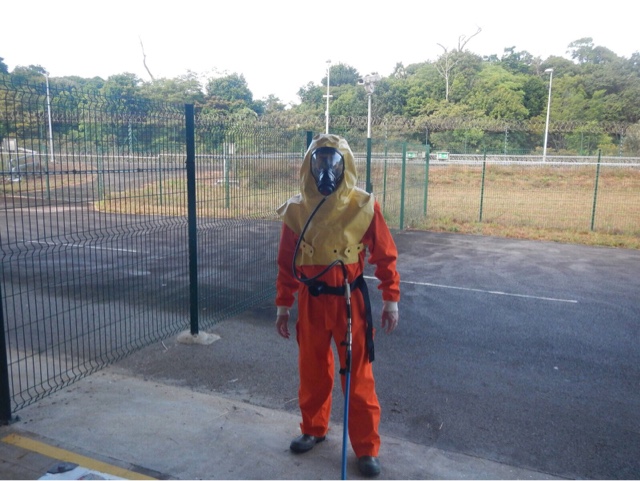 Après les activités de remplissage, nous devons décontaminer notre équipement de remplissage pour le rendre sûr pour son transport retour en Grande Bretagne (UK). Une partie de cette activité est effectuée grâce ce qui s’appelle un vêtement d’éclaboussure [« Splash suit » dans le texte] et avec un appareil respiratoire, quand nous devons démonter les différentes parties. Nous devons nettoyer le système avec de l’eau déminéralisée pour neutraliser le comburant et le carburant. Ensuite, l’équipement est séché avec de l’azote pour l’expédition en UK. Ce processus réduit à quelques ppm (parties par million) de propergol dans l’équipement de sorte qu’il respecte les niveaux de sécurité pour le transport.