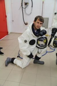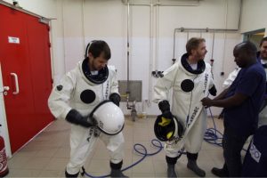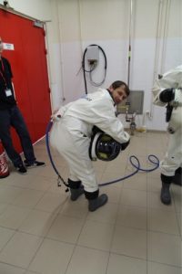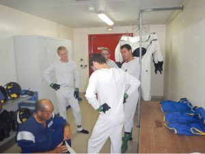 R : Le travail dans un SCAPE peut être un travail très dur si vous devez faire beaucoup de mouvements, les scaphandres sont assez lourds et par conséquent nous préparons la zone de travail à l’avance pour que l‘effort minimum soit exigé dans le scaphandre. Nous préparons tout l‘équipement et nous assurons que la zone est aussi dégagée que possible.Ces scaphandres sont très sûrs mais deviennent très inconfortables après 5 heures dedans.Nous avons également une équipe dans la salle de contrôle qui dictent toutes les opérations à l‘équipe dans la salle de remplissage ; celles–ci sont alors répétées et réalisées. En outre,ils nous demanderont souvent de résoudre quelques énigmes et puzzles, juste pour vérifier juste que sommes toujours OK.