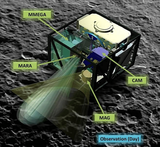Quatre instruments composent Mascot : MASCAM, une caméra avec un éclairage intégré par leds, MARA un radiomètre infrarouge, MASMAG un magnétomètre pour vérifier s’il reste un champ magnétique sur Ryugu et MICROMEGA un microscope infrarouge multispectral