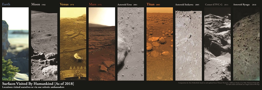 Credits: Lune [Apollo 17, 1972]: NASA ; Venus [Venera-13, 1982]: Soviet Venera Program ; Mars [‘Twilight at Yellowknife Bay’, Curiosity Rover, 2013]: NASA/JPL-Caltech/MSSS/Damia Bouic ; asteroide Eros [NEAR-Shoemaker, 2001]: NEAR Project, JHU APL, NASA ; Titan [Huygens Probe, 2005]: ESA, mission Cassini–Huygens ; astéroïde Itokawa [Hayabusa, 2005]: JAXA ; Comète 67P/C-G [Philae Lander, 2014]: ESA, mission Rosetta ; astéroïde Ryugu [Rover-1B, 2018]: JAXA ; erre [Glenelg Beach, South Australia, 2018]: Alex Delderfield